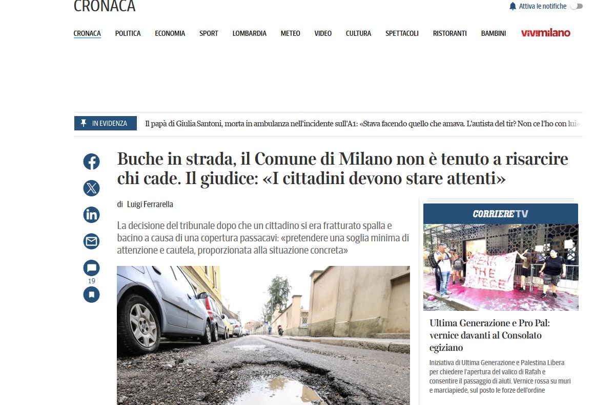 BUCHE IN STRADA: IL COMUNE DI MILANO NON E’ TENUTO A RISARCIRE. FALSO FALSO FALSO!!